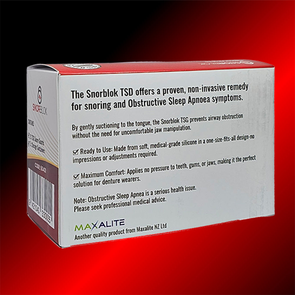 The Snorblok Anti Snore TSG (Tongue Snore Guard) is a clinically proven, simple, inexpensive and non-invasive solution to problem snoring and the symptoms of Obstructive Sleep Apnea. Made of soft medical-grade silicone, it is a one size fits all model and requires no impressions or adjustments and has no moving parts.